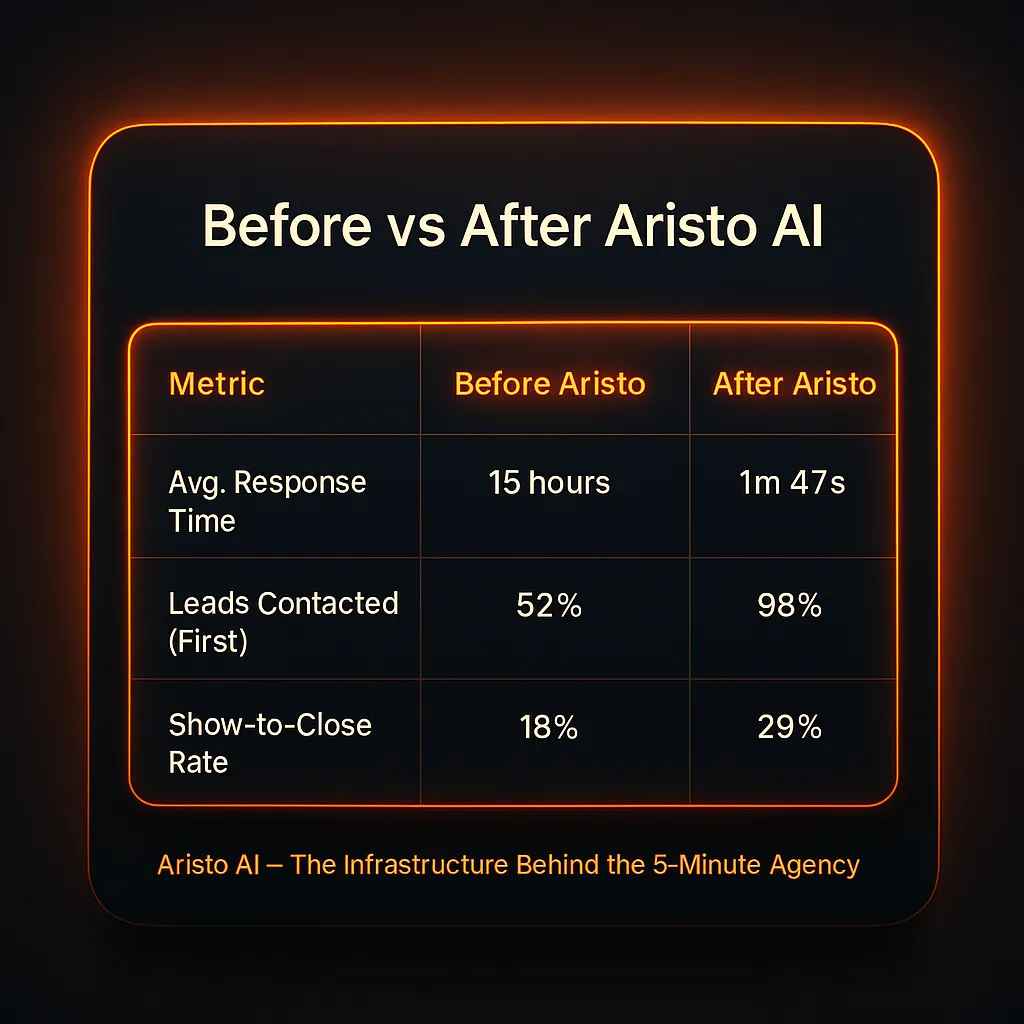 We studied how mid-sized agencies actually lose deals — and it's not marketing. It's infrastructure. Aristo AI installs the response systems that turn 15-hour delays into sub-2-minute contact. Speed builds trust. Trust closes deals. We make you the fastest.